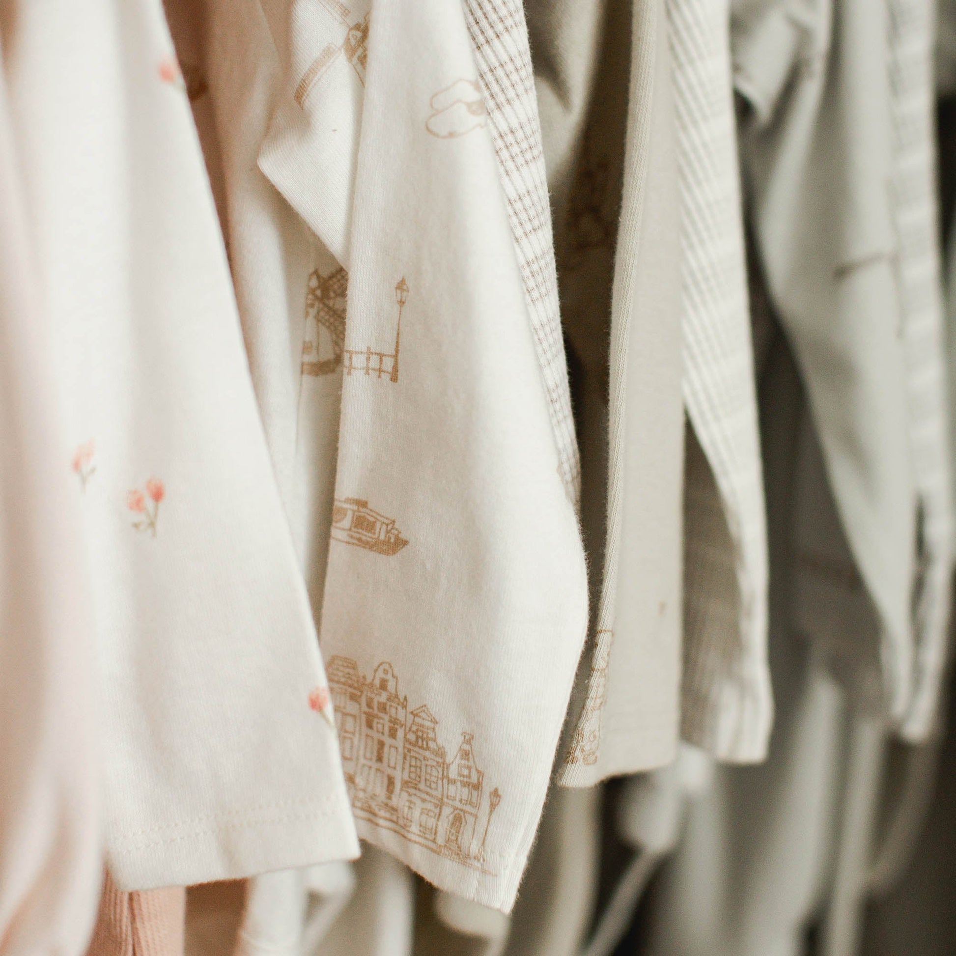- Snap opening along the side of Amsterdam print bodysuit, at left shoulder on printed stripe bodysuit, and at diaper line for easy dressing