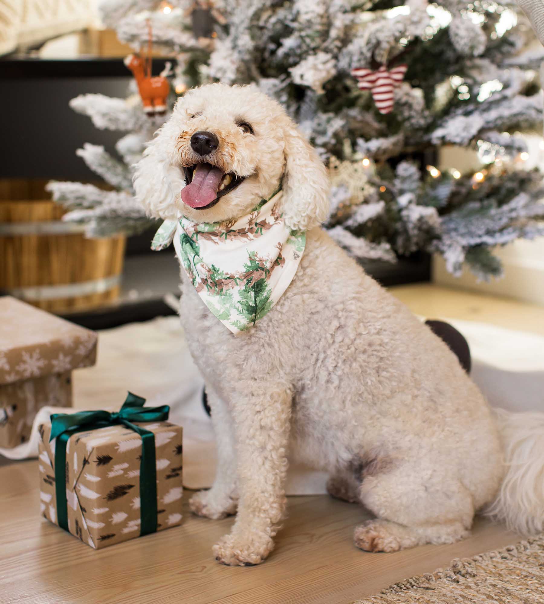 Santa and his reindeer travel through a snowy forest to deliver holiday magic by morning. Our 'Present Delivery' family jammies showcase a hand-painted scene of Santa’s charming sleigh ride and are delightfully cozy for the entire family.