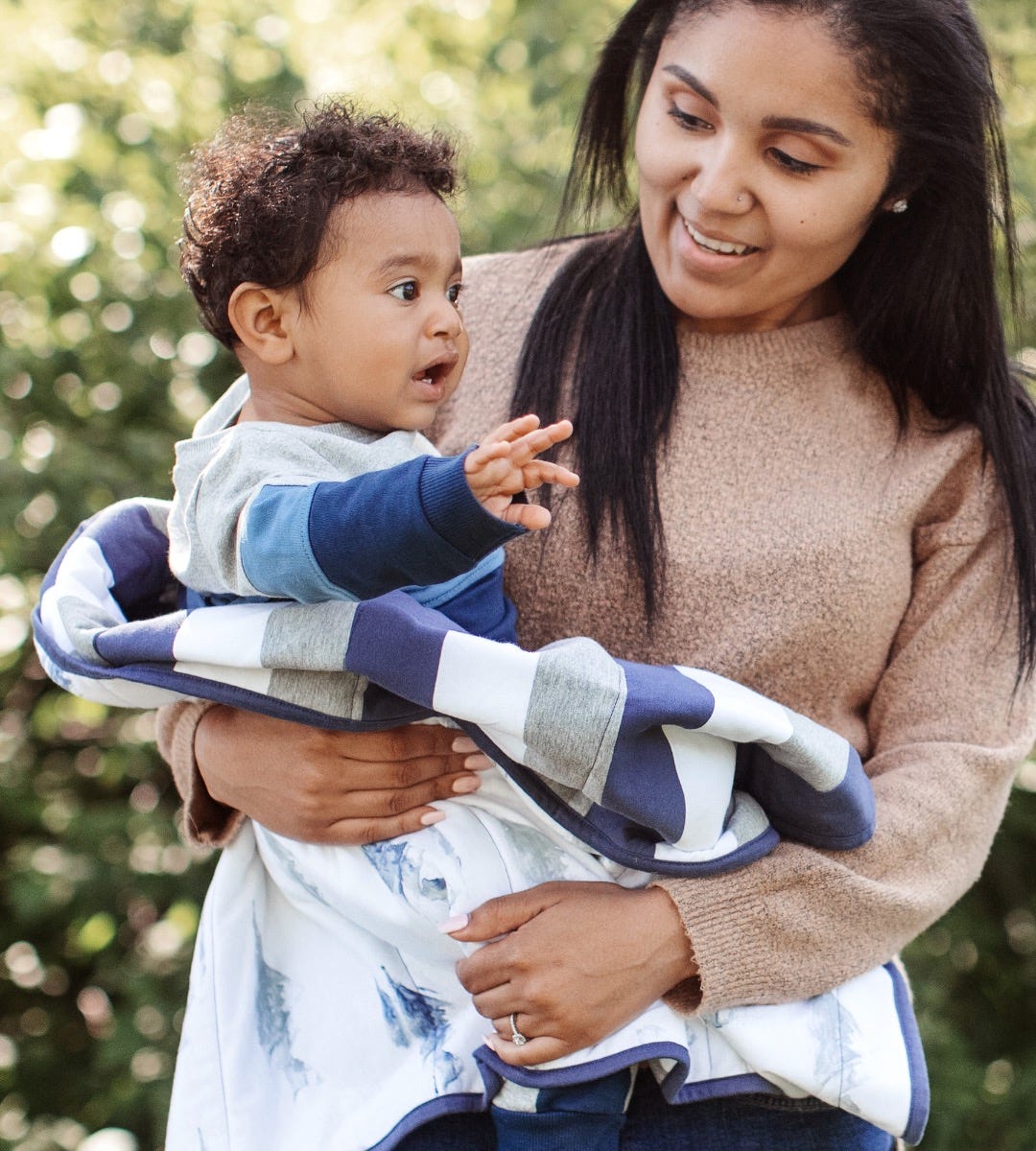 Tell your little bee to keep climbing! This majestic design has beautifully watercolored mountains on one side, and a yarn dye navy, heather grey, and white stripe on the reverse. Incredibly soft, this baby blanket has a variety of uses: tummy time, stroller blanket, carrier cover, nursing cover, you name it! Also makes a great baby shower gift! Quilted for extra warmth, this blanket is both lightweight and cozy.